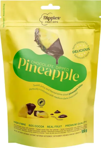 Dippies Fruit Dips Ananas on kuivattua ananasta suklaaseen kastettuna – trooppinen hedelmäinen makeus kohtaa kermaisen suklaan snackissa, joka on yksinkertainen mutta jota on vaikea lopettaa. Sitkeää, makeaa ja hieman eksoottista jokaisessa palassa. 🍍🍫