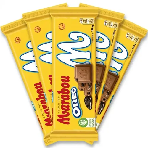 Marabou Oreo yhdistää Maraboun klassisen maitosuklaata rapeisiin kaakaokekseihin ja vaniljatäytteeseen, jotka sopivat täydellisesti yhteen. Kermainen suklaa ympäröi Oreo-keksipaloja ihanaksi tekstuurikontrastiksi. Täydellinen fuusio kahdesta rakastetusta klassikosta.