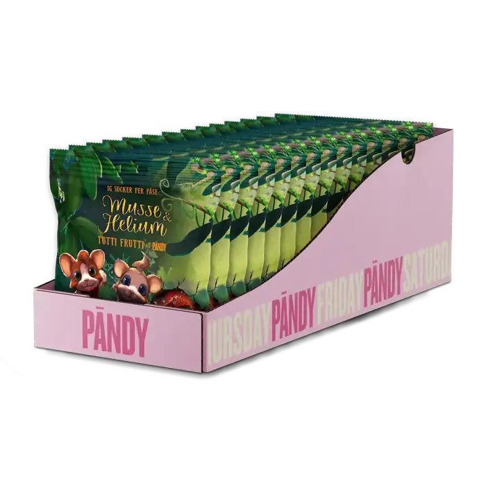 Musse & Helium ovat kaksi sisarushiirtä maagisesta satumaailmasta, jotka tunnetaan parhaiten luojan ja kirjailijan Camilla Brinkkin kirjasarjasta. Saamme seurata heitä värikkäissä seikkailuissa heidän ystäviensä kanssa kaikissa erilaisissa satumaailmoissa, joissa empatia ja huumori ovat keskiössä.Tämä pussi sisältää hedelmäisen makuisia hyytelömakeisia.