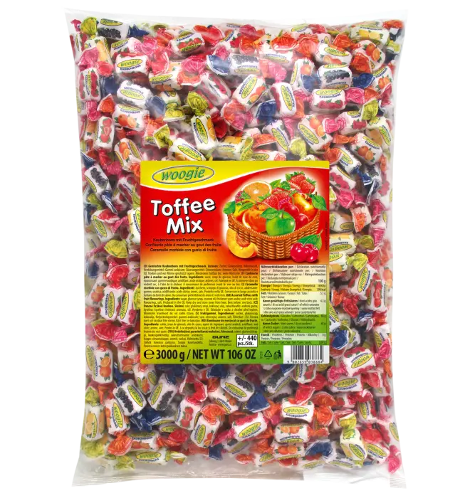 Woogie Chewy Toffee Mix on karkkipussi, jossa leukalihakset saavat treenin ja hedelmäräjähdys ei koskaan lopu! Sitkeää, pureskeltavaa toffeeta eri hedelmämakuisissa, jotka kieltäytyvät antautumasta ilman taistelua - juuri niin kuin toffeen pitää olla. Jokainen pala on pieni kestävyyshaaste, joka palkitsee sinut aalto toisensa jälkeen hedelmäistä hyvyyttä. Täydellinen, kun haluat karkkia, joka pysyy kauan suussa ja antaa leuoille tekemistä. Tämä on maraton-karkkia, ei sprinttiä!