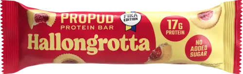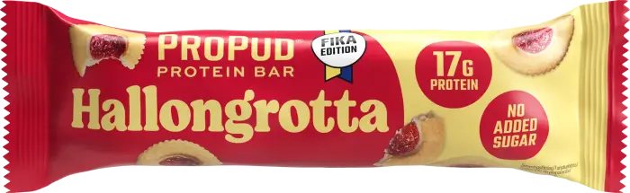 ProPud Hallongrotta Bar on lapsuuden suosikki proteiinimuodossa! Silkinpehmeä valkosuklaa pehmeän kakkumaisen patukan ympärillä hedelmäisen vadelmakermanα ja kakkupaloilla - aivan kuin klassikko mutta 17g proteiinilla. Täydellinen tasapaino marjaisen raikkаuden ja kermaisen suklaan välillä, joka vie sinut takaisin kahvipöytään, mutta ilman sokerikolauksia. Täydellinen kun kaipaat hallongrottoja mutta haluat myös lihasmassasi!