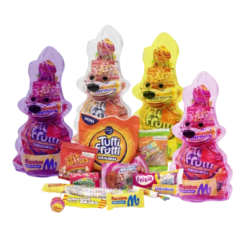 Pääsiäispupu täynnä karkkiyllätyksiä! Tämä värikäs muovipupu on täynnä suosittuja karkkimerkkejä - Marabou maitosuklaa, Mentos, Tutti Frutti, Mamba, Sour Worms, Cola Bottles ja paljon muuta. Täydellinen pääsiäislahja lapsille ja aikuisille jotka rakastavat karkkia. Väri valitaan satunnaisesti - violetti, läpinäkyvä, keltainen tai vaaleanpunainen. Mitä muuta voi toivoa pääsiäiseksi? 🐰🍬