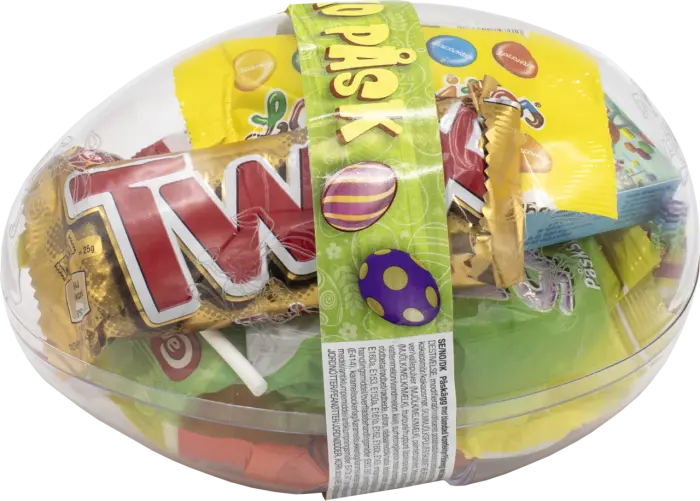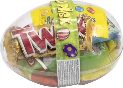Pääsiäismuna täynnä karkkiyllätyksiä! Tämä läpinäkyvä munamuovipakkaus on täynnä suosittuja karkkipaloja - Twix, Lacasitos ja paljon muuta hyvää. Täydellinen pääsiäislahja lapsille ja aikuisille jotka rakastavat avata jotain tietämättä mitä sisällä piilee. Jännittävämpi kuin tavallinen suklaamuna - täällä saat kokonaisen karkkiseikkailun! 🐣🍬