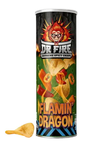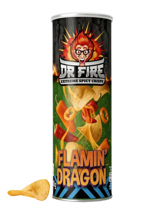 Lohikäärmeen hengitys sipsimuodossa! Dr Fire Extreme Spicy Crisps Flamin' Dragon on sipsit rohkeille - äärimmäisen tulisia ja mausteisia lohikäärmeen omalla tulisuudella. Rapeat sipsit jotka polttavat ensimmäisestä purauksesta eivätkä päästä irti. Täydellinen sinulle joka rakastat tulisia haasteita tai haluat tehdä vaikutuksen kavereihin sietokyvylläsi. Varoitus: tämä ei ole leikkiä! 🐉🔥