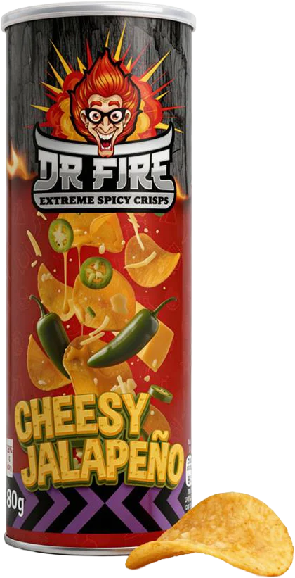 Juustoista ja tulista! Dr Fire Extreme Spicy Crisps Cheesy Jalapeño on sipsit, jotka yhdistävät kermaisen juuston tulisen jalapeño-kickin kanssa. Täydellinen tasapaino juustoisen hyvyyden ja chili-tulisuuden välillä, joka tekee niistä riippuvuutta aiheuttavia. Sinulle joka rakastat sekä juustoa että tulista ruokaa, tai haluat jotain vähän hienostuneempaa kuin tavalliset juustosipsit. Juusto kohtaa tulisuuden! 🧀🌶️